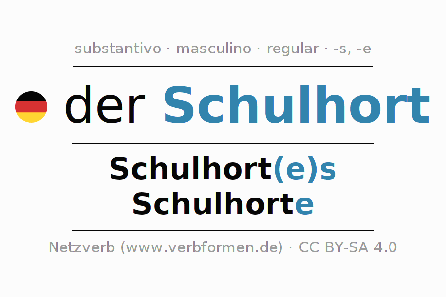A declinação do substantivo Schulhort (escola de tempo integral, pólo escolar) está no genitivo singular Schulhort(e)s e no nominativo plural Schulhorte . O substantivo forte Schulhort é declinado com a terminação es/e. O gênero gramatical de Schulhort é masculino e o artigo definido é 'der'. Não se pode somente declinar o substantivo Schulhort mas sim todos os substantivos em alemão. Comentários ☆