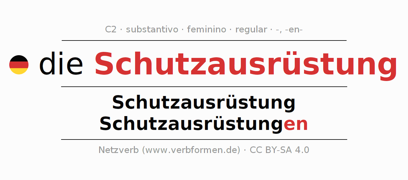 A declinação do substantivo Schutzausrüstung (EPI, equipamento de proteção) está no genitivo singular Schutzausrüstung e no nominativo plural Schutzausrüstungen . O substantivo fraco Schutzausrüstung é declinado com a terminação -/en. O gênero gramatical de Schutzausrüstung é feminino e o artigo definido é "die". Não se pode somente declinar o substantivo Schutzausrüstung mas sim todos os substantivos em alemão. O substantivo faz parte do vocabulário referente ao Certificado em Alemão do Nível C2. Comentários ☆