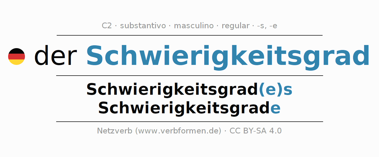 Declinação de Schwierigkeitsgrad é apresentada em uma tabela com todas as formas no singular e no plural (plural) e em todos os quatro casos: nominativo (1º caso), genitivo (2º caso), dativo (3º caso) e acusativo (4º caso) . Especialmente para os alunos de alemão, a correta declinação da palavra Schwierigkeitsgrad é fundamental.