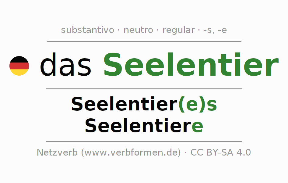 A declinação do substantivo Seelentier (animal espiritual) está no genitivo singular Seelentier(e)s e no nominativo plural Seelentiere . O substantivo forte Seelentier é declinado com a terminação es/e. O gênero gramatical de Seelentier é neutro e o artigo definido é "das". Não se pode somente declinar o substantivo Seelentier mas sim todos os substantivos em alemão. Comentários ☆