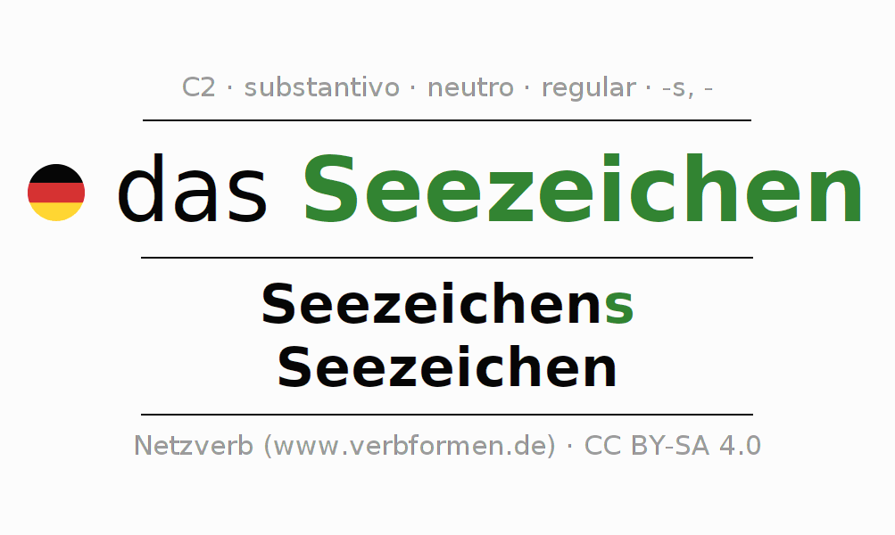 A declinação do substantivo Seezeichen (marcador, sinal) está no genitivo singular Seezeichens e no nominativo plural Seezeichen . O substantivo forte Seezeichen é declinado com a terminação s/-. O gênero gramatical de Seezeichen é neutro e o artigo definido é "das". Não se pode somente declinar o substantivo Seezeichen mas sim todos os substantivos em alemão. O substantivo faz parte do vocabulário referente ao Certificado em Alemão do Nível C2. Comentários ☆