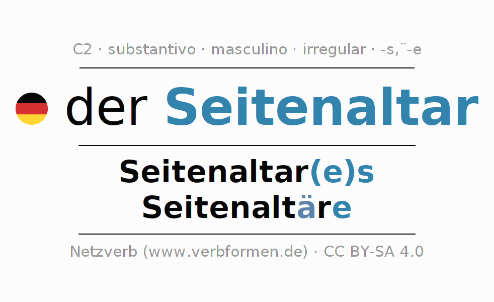 Declinação de Seitenaltar é apresentada em uma tabela com todas as formas no singular e no plural (plural) e em todos os quatro casos: nominativo (1º caso), genitivo (2º caso), dativo (3º caso) e acusativo (4º caso) . Especialmente para os alunos de alemão, a correta declinação da palavra Seitenaltar é fundamental.