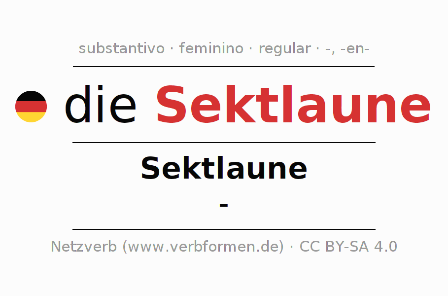 A declinação do substantivo Sektlaune (humor de champanhe) está no genitivo singular Sektlaune e no nominativo plural - . O substantivo fraco Sektlaune é declinado com a terminação -/-. Não há formas no plural. O gênero gramatical de Sektlaune é feminino e o artigo definido é "die". Não se pode somente declinar o substantivo Sektlaune mas sim todos os substantivos em alemão. Comentários ☆