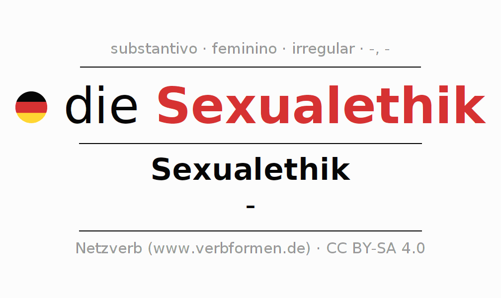 A declinação do substantivo Sexualethik (ética sexual) está no genitivo singular Sexualethik e no nominativo plural - . O substantivo Sexualethik é declinado com as terminações -/-. Não há formas no plural. O gênero gramatical de Sexualethik é feminino e o artigo definido é "die". Não se pode somente declinar o substantivo Sexualethik mas sim todos os substantivos em alemão. Comentários ☆