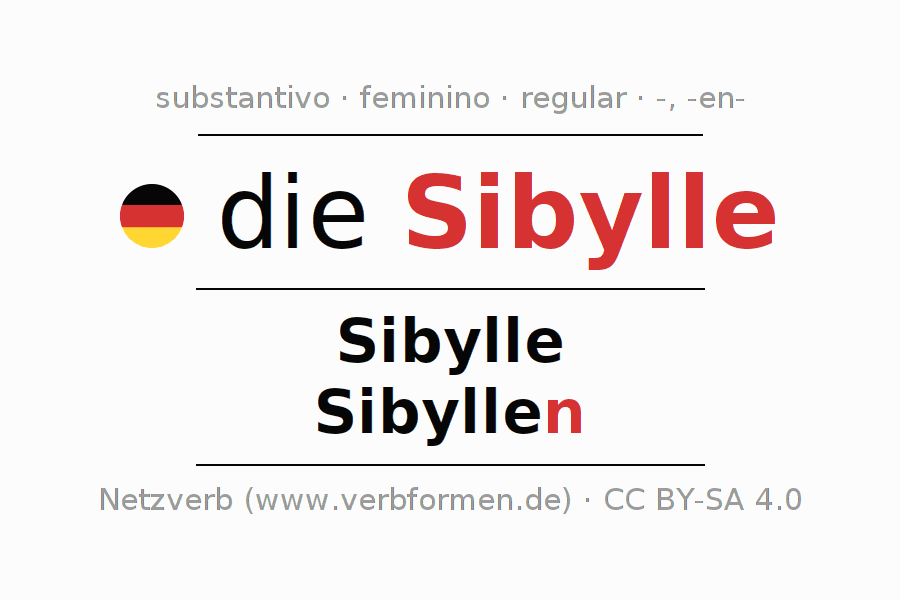 A declinação do substantivo Sibylle (sibila) está no genitivo singular Sibylle e no nominativo plural Sibyllen . O substantivo fraco Sibylle é declinado com a terminação -/n. O gênero gramatical de Sibylle é feminino e o artigo definido é "die". Não se pode somente declinar o substantivo Sibylle mas sim todos os substantivos em alemão. Comentários ☆