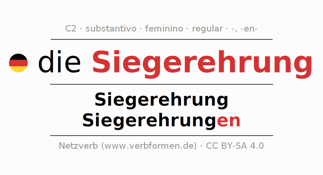 A declinação do substantivo Siegerehrung (cerimônia de premiação, entrega dos prémios) está no genitivo singular Siegerehrung e no nominativo plural Siegerehrungen . O substantivo fraco Siegerehrung é declinado com a terminação -/en. O gênero gramatical de Siegerehrung é feminino e o artigo definido é "die". Não se pode somente declinar o substantivo Siegerehrung mas sim todos os substantivos em alemão. O substantivo faz parte do vocabulário referente ao Certificado em Alemão do Nível C2. Comentários ☆
