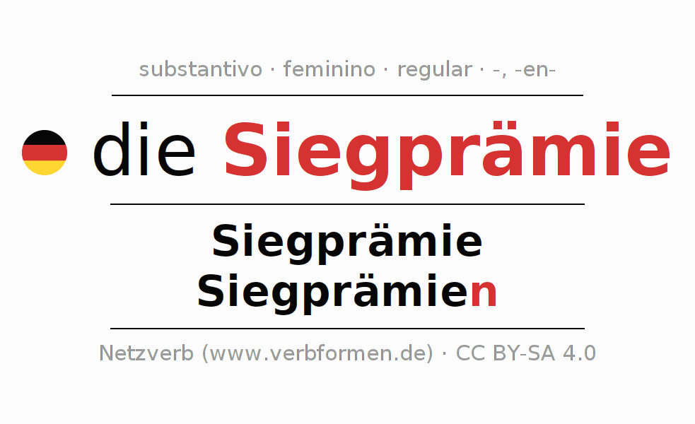 A declinação do substantivo Siegprämie (bônus de vitória, prêmio de vitória) está no genitivo singular Siegprämie e no nominativo plural Siegprämien . O substantivo fraco Siegprämie é declinado com a terminação -/n. O gênero gramatical de Siegprämie é feminino e o artigo definido é "die". Não se pode somente declinar o substantivo Siegprämie mas sim todos os substantivos em alemão. Comentários ☆
