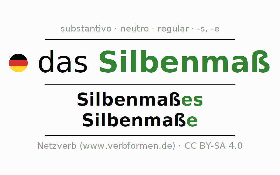 A declinação do substantivo Silbenmaß (contagem de sílabas) está no genitivo singular Silbenmaßes e no nominativo plural Silbenmaße . O substantivo forte Silbenmaß é declinado com a terminação es/e. O gênero gramatical de Silbenmaß é neutro e o artigo definido é "das". Não se pode somente declinar o substantivo Silbenmaß mas sim todos os substantivos em alemão. Comentários ☆