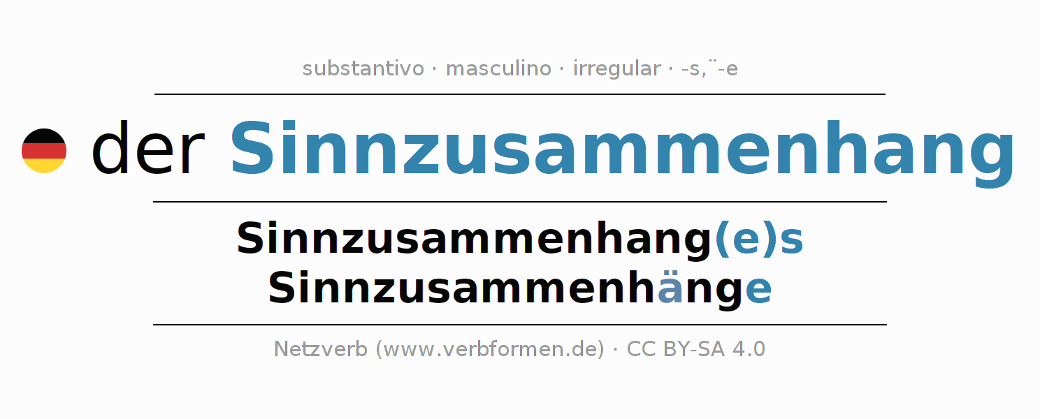 A declinação do substantivo Sinnzusammenhang (contexto lógico) está no genitivo singular Sinnzusammenhang(e)s e no nominativo plural Sinnzusammenhänge . O substantivo forte Sinnzusammenhang é declinado com a terminação es/ä-e. No plural com um trema. O gênero gramatical de Sinnzusammenhang é masculino e o artigo definido é 'der'. Não se pode somente declinar o substantivo Sinnzusammenhang mas sim todos os substantivos em alemão. Comentários ☆