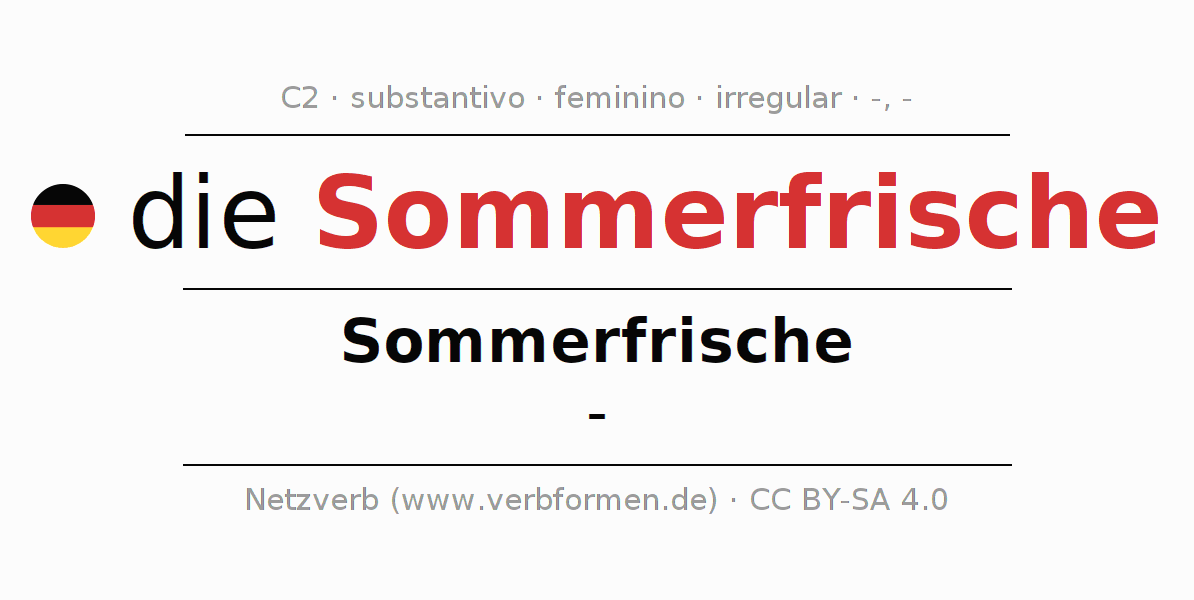 A declinação do substantivo Sommerfrische (férias de verão, estância) está no genitivo singular Sommerfrische e no nominativo plural - . O substantivo Sommerfrische é declinado com as terminações -/-. Não há formas no plural. O gênero gramatical de Sommerfrische é feminino e o artigo definido é "die". Não se pode somente declinar o substantivo Sommerfrische mas sim todos os substantivos em alemão. O substantivo faz parte do vocabulário referente ao Certificado em Alemão do Nível C2. Comentários ☆