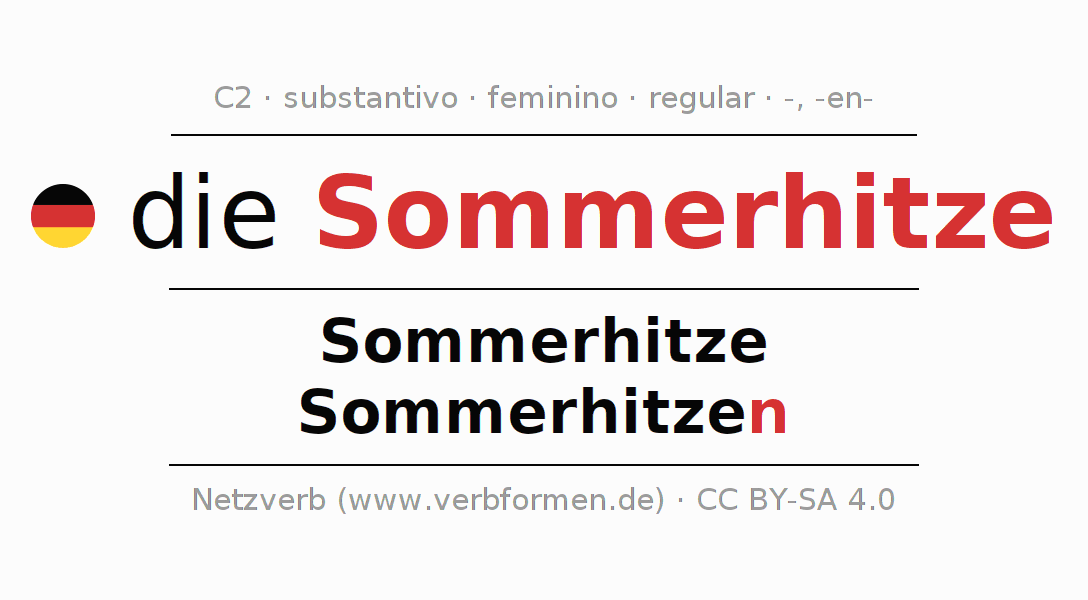 Declinação de Sommerhitze é apresentada em uma tabela com todas as formas no singular e no plural (plural) e em todos os quatro casos: nominativo (1º caso), genitivo (2º caso), dativo (3º caso) e acusativo (4º caso) . Especialmente para os alunos de alemão, a correta declinação da palavra Sommerhitze é fundamental.