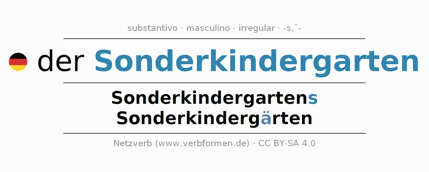 - Singular: der Sonderkindergarten, des Sonderkindergartens, dem Sonderkindergarten, den Sonderkindergarten