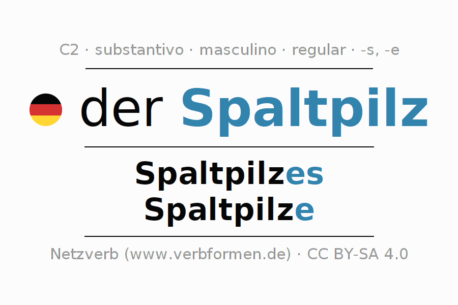 Declinação de Spaltpilz é apresentada em uma tabela com todas as formas no singular e no plural (plural) e em todos os quatro casos: nominativo (1º caso), genitivo (2º caso), dativo (3º caso) e acusativo (4º caso) . Especialmente para os alunos de alemão, a correta declinação da palavra Spaltpilz é fundamental.