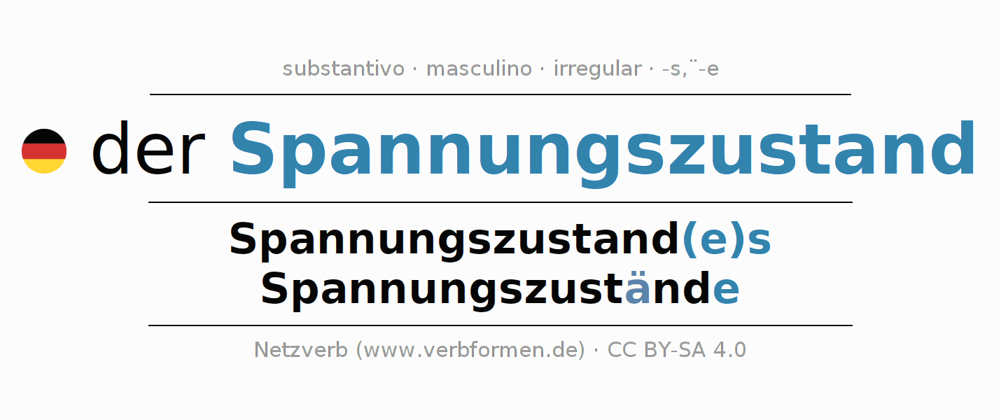 Declinação de Spannungszustand é apresentada em uma tabela com todas as formas no singular e no plural (plural) e em todos os quatro casos: nominativo (1º caso), genitivo (2º caso), dativo (3º caso) e acusativo (4º caso) . Especialmente para os alunos de alemão, a correta declinação da palavra Spannungszustand é fundamental.