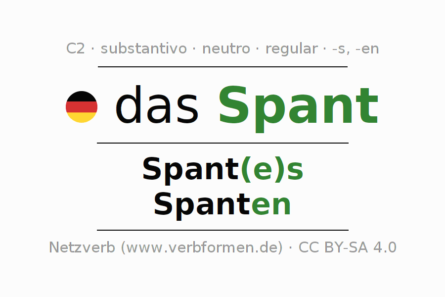 Declinação de das Spant é apresentada em uma tabela com todas as formas no singular e no plural (plural) e em todos os quatro casos: nominativo (1º caso), genitivo (2º caso), dativo (3º caso) e acusativo (4º caso) . Especialmente para os alunos de alemão, a correta declinação da palavra das Spant é fundamental.