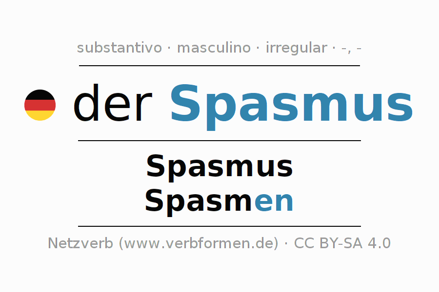 Declinação de Spasmus é apresentada em uma tabela com todas as formas no singular e no plural (plural) e em todos os quatro casos: nominativo (1º caso), genitivo (2º caso), dativo (3º caso) e acusativo (4º caso) . Especialmente para os alunos de alemão, a correta declinação da palavra Spasmus é fundamental.