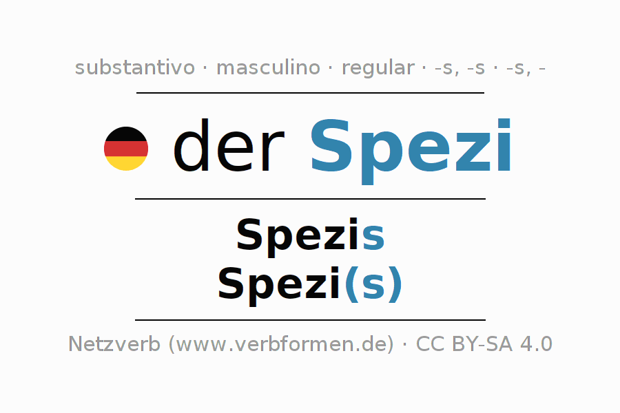 A declinação do substantivo Spezi (amigo íntimo, bebida mista) está no genitivo singular Spezis e no nominativo plural Spezi(s) . O substantivo forte Spezi é declinado com a terminação s/s/-. O gênero gramatical de Spezi é masculino e o artigo definido é 'der'. O substantivo também pode ser usado com outros géneros e outros artigos. Não se pode somente declinar o substantivo Spezi mas sim todos os substantivos em alemão. Comentários ☆