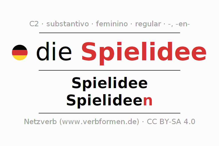Declinação de Spielidee é apresentada em uma tabela com todas as formas no singular e no plural (plural) e em todos os quatro casos: nominativo (1º caso), genitivo (2º caso), dativo (3º caso) e acusativo (4º caso) . Especialmente para os alunos de alemão, a correta declinação da palavra Spielidee é fundamental.