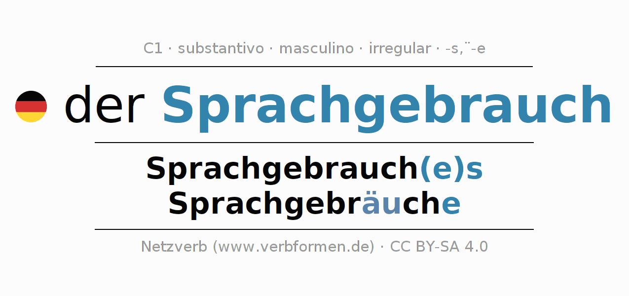 Declinação de Sprachgebrauch é apresentada em uma tabela com todas as formas no singular e no plural (plural) e em todos os quatro casos: nominativo (1º caso), genitivo (2º caso), dativo (3º caso) e acusativo (4º caso) . Especialmente para os alunos de alemão, a correta declinação da palavra Sprachgebrauch é fundamental.