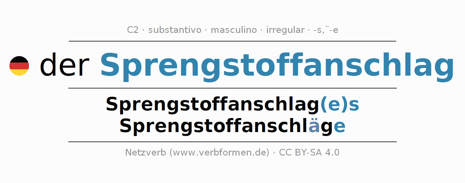 Declinação de Sprengstoffanschlag é apresentada em uma tabela com todas as formas no singular e no plural (plural) e em todos os quatro casos: nominativo (1º caso), genitivo (2º caso), dativo (3º caso) e acusativo (4º caso) . Especialmente para os alunos de alemão, a correta declinação da palavra Sprengstoffanschlag é fundamental.