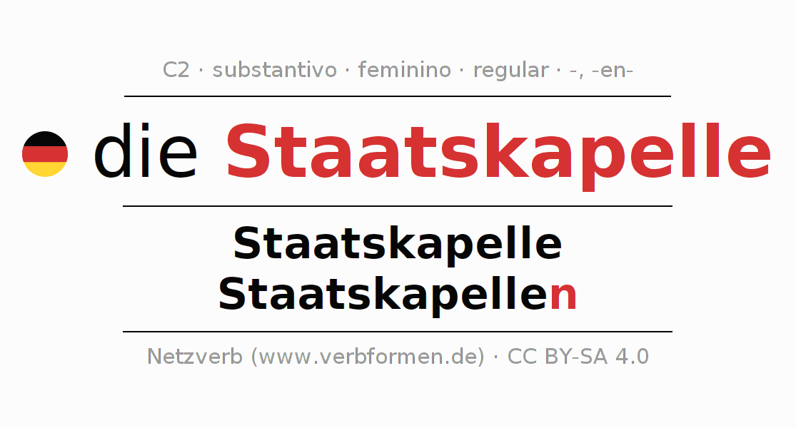 A declinação do substantivo Staatskapelle (orquestra, orquestra sinfônica) está no genitivo singular Staatskapelle e no nominativo plural Staatskapellen . O substantivo fraco Staatskapelle é declinado com a terminação -/n. O gênero gramatical de Staatskapelle é feminino e o artigo definido é "die". Não se pode somente declinar o substantivo Staatskapelle mas sim todos os substantivos em alemão. O substantivo faz parte do vocabulário referente ao Certificado em Alemão do Nível C2. Comentários ☆