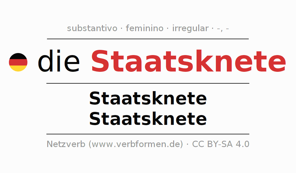 Declinação de Staatsknete é apresentada em uma tabela com todas as formas no singular e no plural (plural) e em todos os quatro casos: nominativo (1º caso), genitivo (2º caso), dativo (3º caso) e acusativo (4º caso) . Especialmente para os alunos de alemão, a correta declinação da palavra Staatsknete é fundamental.