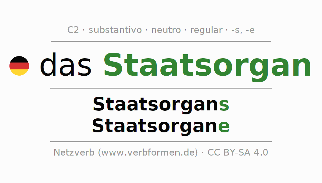- Plural: die Staatsorgane, der Staatsorgane, den Staatsorganen, die Staatsorgane