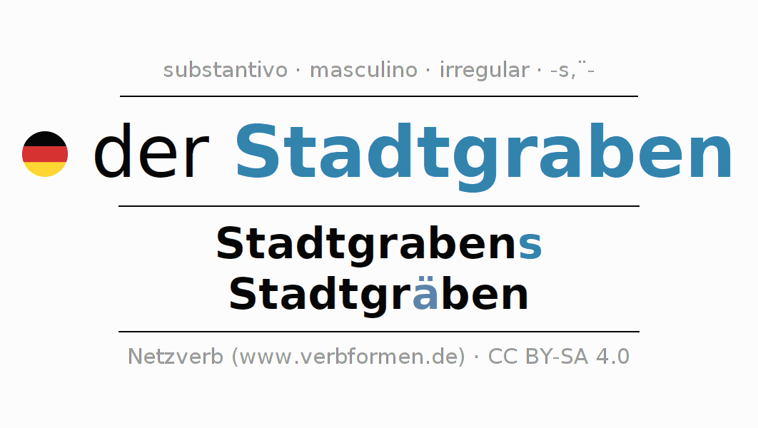 A declinação do substantivo Stadtgraben (fosso, vala) está no genitivo singular Stadtgrabens e no nominativo plural Stadtgräben . O substantivo forte Stadtgraben é declinado com a terminação s/ä-. No plural com um trema. O gênero gramatical de Stadtgraben é masculino e o artigo definido é 'der'. Não se pode somente declinar o substantivo Stadtgraben mas sim todos os substantivos em alemão. Comentários ☆