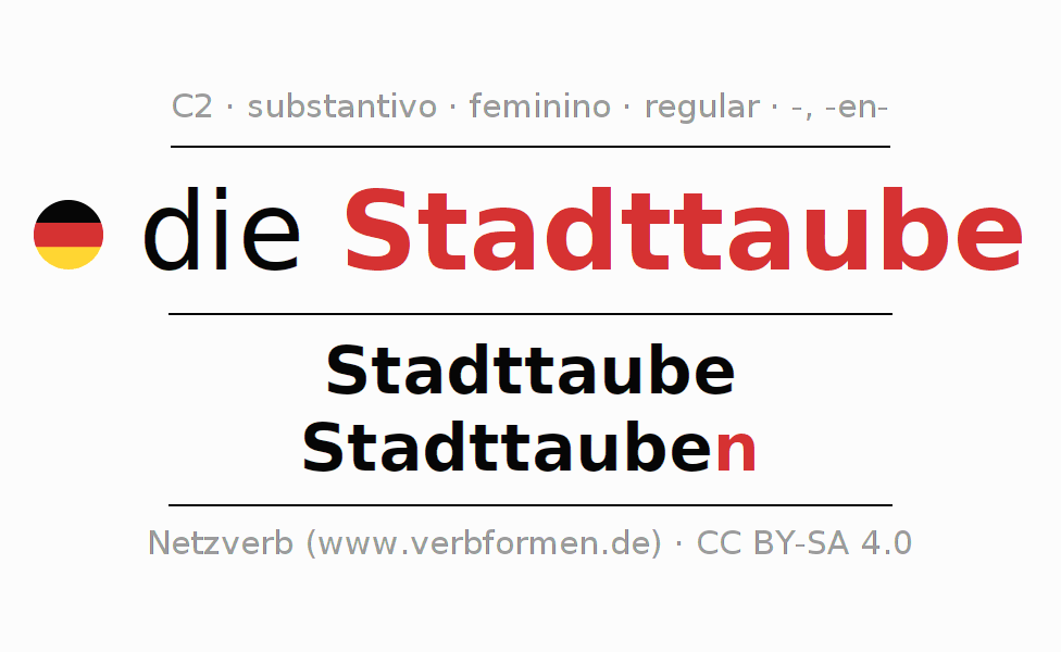 Declinação de Stadttaube é apresentada em uma tabela com todas as formas no singular e no plural (plural) e em todos os quatro casos: nominativo (1º caso), genitivo (2º caso), dativo (3º caso) e acusativo (4º caso) . Especialmente para os alunos de alemão, a correta declinação da palavra Stadttaube é fundamental.