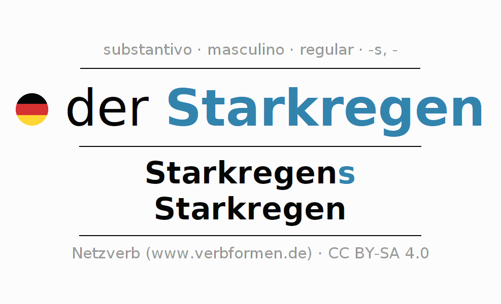 A declinação do substantivo Starkregen (chuva forte, chuva intensa) está no genitivo singular Starkregens e no nominativo plural Starkregen . O substantivo forte Starkregen é declinado com a terminação s/-. O gênero gramatical de Starkregen é masculino e o artigo definido é 'der'. Não se pode somente declinar o substantivo Starkregen mas sim todos os substantivos em alemão. Comentários ☆