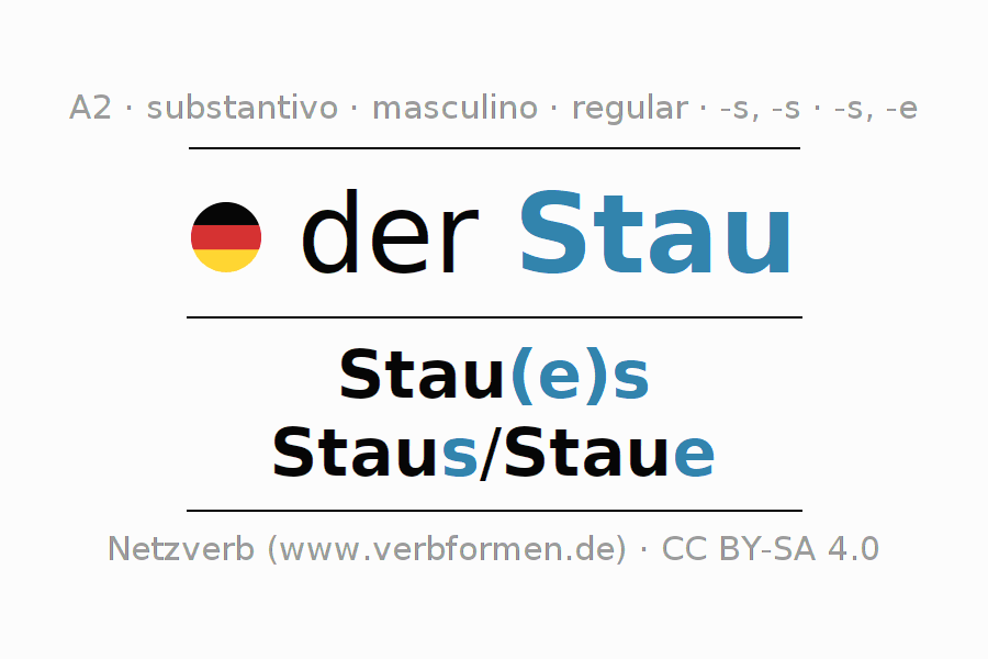 Declinação de Stau é apresentada em uma tabela com todas as formas no singular e no plural (plural) e em todos os quatro casos: nominativo (1º caso), genitivo (2º caso), dativo (3º caso) e acusativo (4º caso) . Especialmente para os alunos de alemão, a correta declinação da palavra Stau é fundamental.