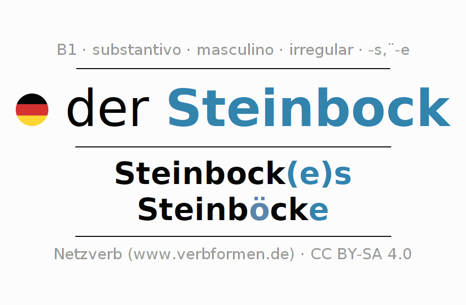 A declinação do substantivo Steinbock (Capricórnio, bode) está no genitivo singular Steinbock(e)s e no nominativo plural Steinböcke . O substantivo forte Steinbock é declinado com a terminação es/ö-e. No plural com um trema. O gênero gramatical de Steinbock é masculino e o artigo definido é 'der'. Não se pode somente declinar o substantivo Steinbock mas sim todos os substantivos em alemão. O substantivo faz parte do vocabulário referente ao Certificado em Alemão do Nível B1. Comentários ☆