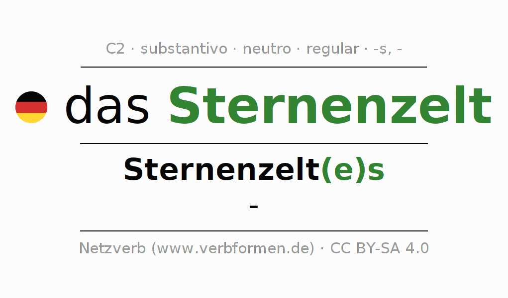 A declinação do substantivo Sternenzelt (céu estrelado) está no genitivo singular Sternenzelt(e)s e no nominativo plural - . O substantivo forte Sternenzelt é declinado com a terminação es/-. Não há formas no plural. O gênero gramatical de Sternenzelt é neutro e o artigo definido é "das". Não se pode somente declinar o substantivo Sternenzelt mas sim todos os substantivos em alemão. O substantivo faz parte do vocabulário referente ao Certificado em Alemão do Nível C2. Comentários ☆