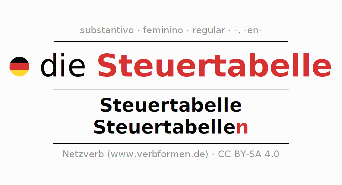 A declinação do substantivo Steuertabelle (tabela de impostos) está no genitivo singular Steuertabelle e no nominativo plural Steuertabellen . O substantivo fraco Steuertabelle é declinado com a terminação -/n. O gênero gramatical de Steuertabelle é feminino e o artigo definido é "die". Não se pode somente declinar o substantivo Steuertabelle mas sim todos os substantivos em alemão. Comentários ☆
