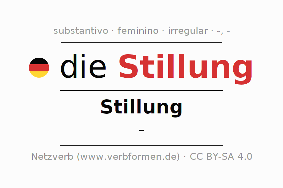 Declinação de Stillung é apresentada em uma tabela com todas as formas no singular e no plural (plural) e em todos os quatro casos: nominativo (1º caso), genitivo (2º caso), dativo (3º caso) e acusativo (4º caso) . Especialmente para os alunos de alemão, a correta declinação da palavra Stillung é fundamental.