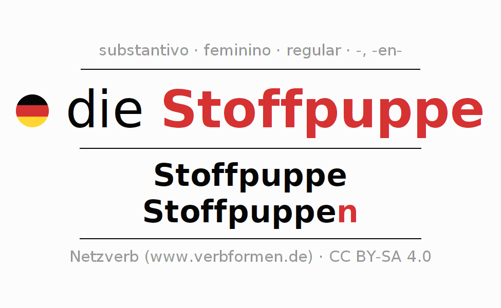 A declinação do substantivo Stoffpuppe (boneca de pano) está no genitivo singular Stoffpuppe e no nominativo plural Stoffpuppen . O substantivo fraco Stoffpuppe é declinado com a terminação -/n. O gênero gramatical de Stoffpuppe é feminino e o artigo definido é "die". Não se pode somente declinar o substantivo Stoffpuppe mas sim todos os substantivos em alemão. Comentários ☆
