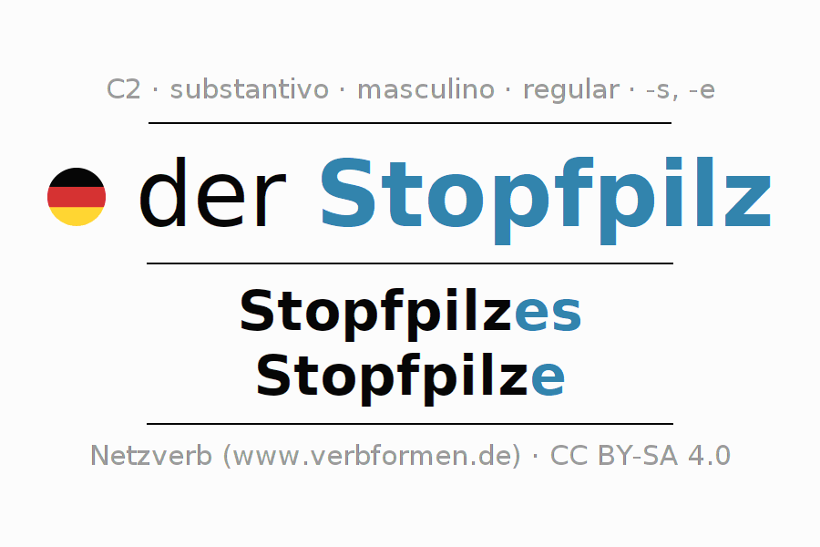 Declinação de Stopfpilz é apresentada em uma tabela com todas as formas no singular e no plural (plural) e em todos os quatro casos: nominativo (1º caso), genitivo (2º caso), dativo (3º caso) e acusativo (4º caso) . Especialmente para os alunos de alemão, a correta declinação da palavra Stopfpilz é fundamental.