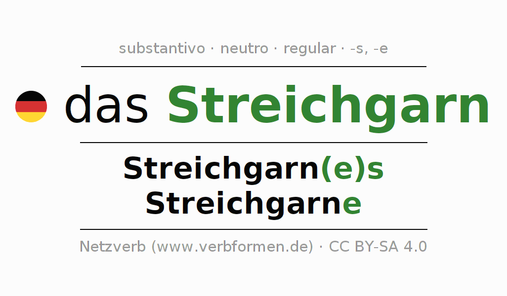 Declinação de Streichgarn é apresentada em uma tabela com todas as formas no singular e no plural (plural) e em todos os quatro casos: nominativo (1º caso), genitivo (2º caso), dativo (3º caso) e acusativo (4º caso) . Especialmente para os alunos de alemão, a correta declinação da palavra Streichgarn é fundamental.