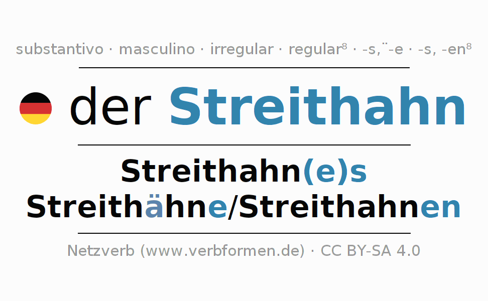 Declinação de Streithahn é apresentada em uma tabela com todas as formas no singular e no plural (plural) e em todos os quatro casos: nominativo (1º caso), genitivo (2º caso), dativo (3º caso) e acusativo (4º caso) . Especialmente para os alunos de alemão, a correta declinação da palavra Streithahn é fundamental.