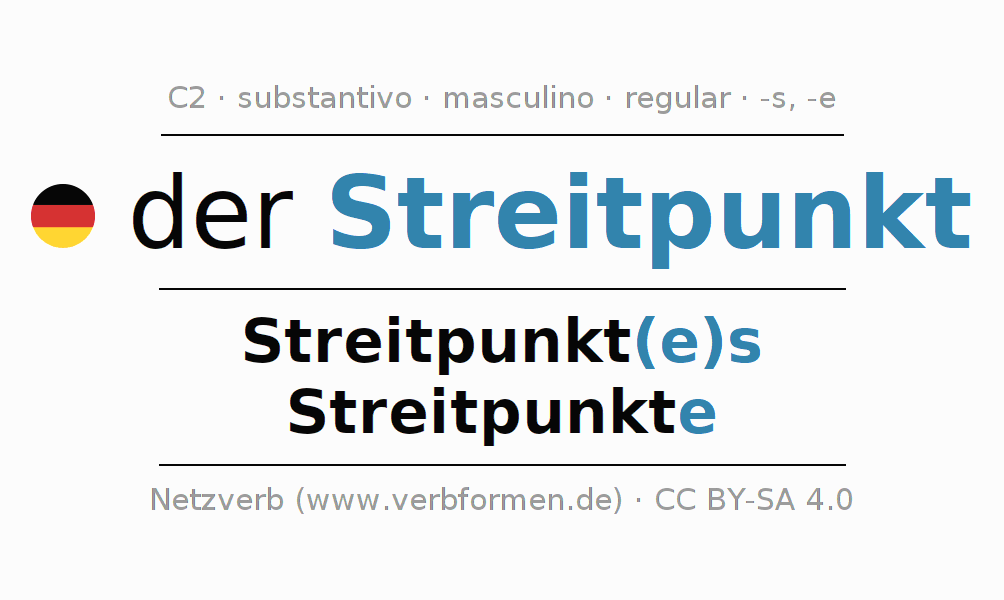 A declinação do substantivo Streitpunkt (assunto controverso, objeto de disputa) está no genitivo singular Streitpunkt(e)s e no nominativo plural Streitpunkte . O substantivo forte Streitpunkt é declinado com a terminação es/e. O gênero gramatical de Streitpunkt é masculino e o artigo definido é 'der'. Não se pode somente declinar o substantivo Streitpunkt mas sim todos os substantivos em alemão. O substantivo faz parte do vocabulário referente ao Certificado em Alemão do Nível C2. Comentários ☆
