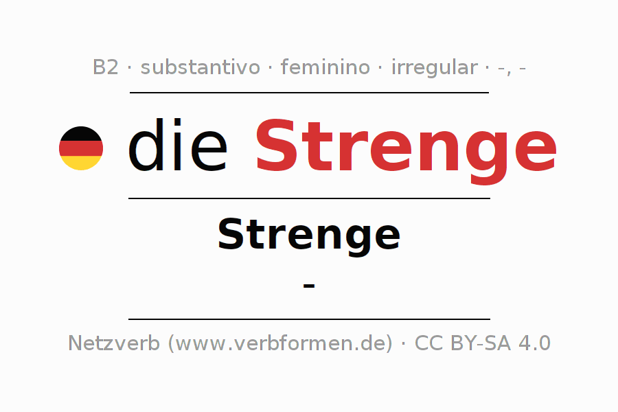 Declinação de Strenge é apresentada em uma tabela com todas as formas no singular e no plural (plural) e em todos os quatro casos: nominativo (1º caso), genitivo (2º caso), dativo (3º caso) e acusativo (4º caso) . Especialmente para os alunos de alemão, a correta declinação da palavra Strenge é fundamental.