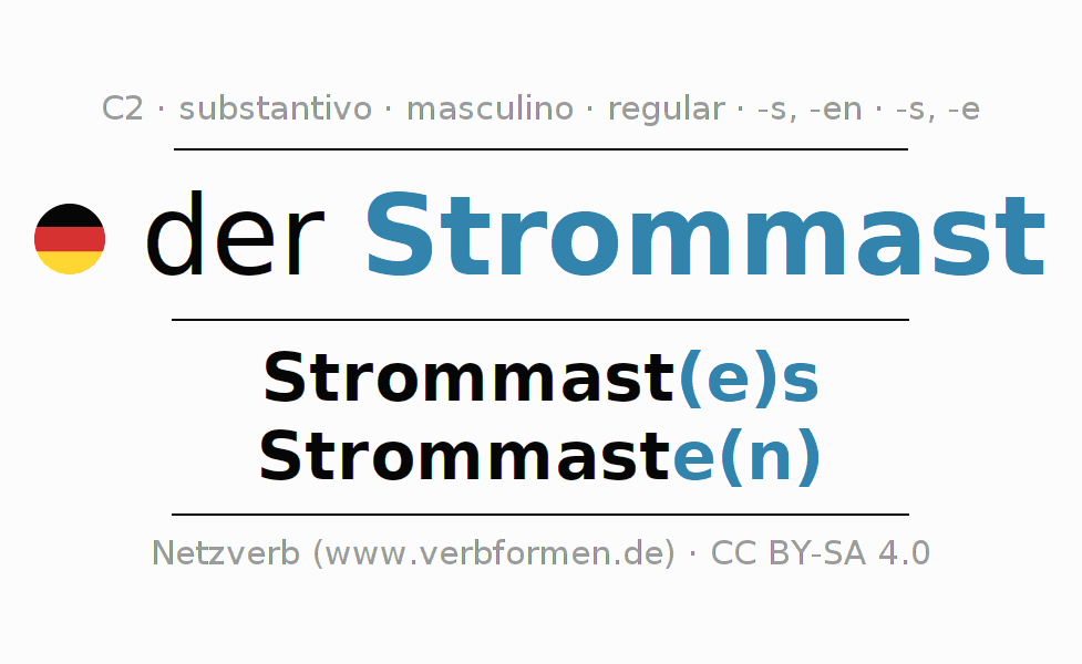Declinação de Strommast é apresentada em uma tabela com todas as formas no singular e no plural (plural) e em todos os quatro casos: nominativo (1º caso), genitivo (2º caso), dativo (3º caso) e acusativo (4º caso) . Especialmente para os alunos de alemão, a correta declinação da palavra Strommast é fundamental.