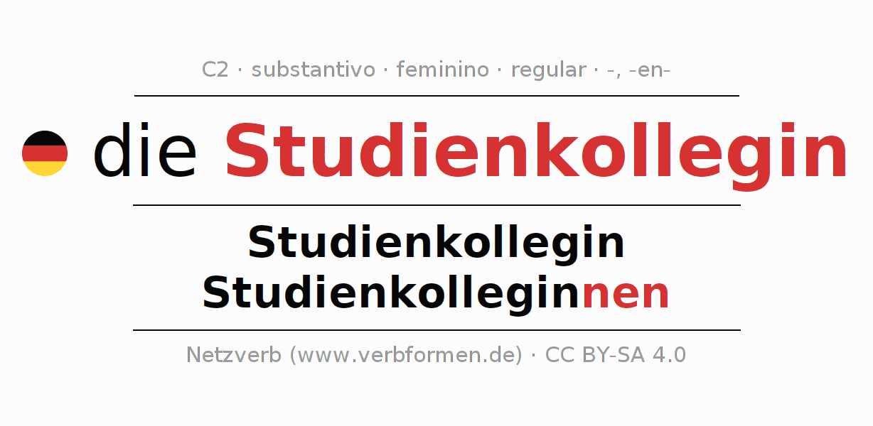Declinação de Studienkollegin é apresentada em uma tabela com todas as formas no singular e no plural (plural) e em todos os quatro casos: nominativo (1º caso), genitivo (2º caso), dativo (3º caso) e acusativo (4º caso) . Especialmente para os alunos de alemão, a correta declinação da palavra Studienkollegin é fundamental.