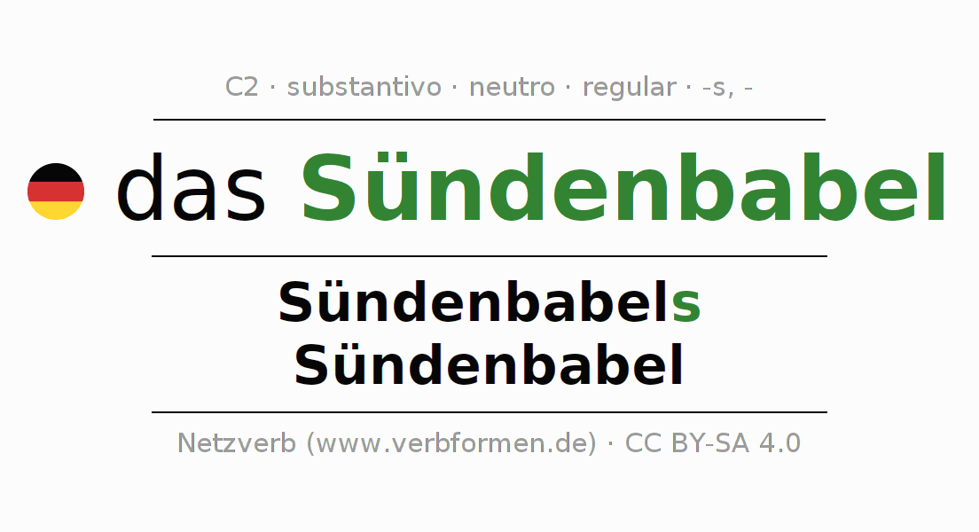 A declinação do substantivo Sündenbabel (local de devassidão, lugar de pecados) está no genitivo singular Sündenbabels e no nominativo plural Sündenbabel . O substantivo forte Sündenbabel é declinado com a terminação s/-. O gênero gramatical de Sündenbabel é neutro e o artigo definido é "das". Não se pode somente declinar o substantivo Sündenbabel mas sim todos os substantivos em alemão. O substantivo faz parte do vocabulário referente ao Certificado em Alemão do Nível C2. Comentários ☆