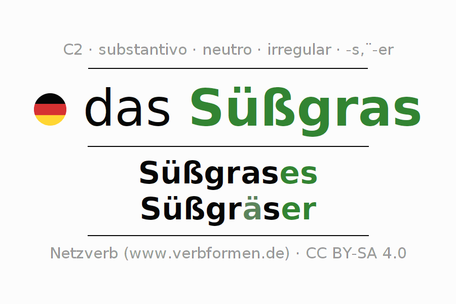 A declinação do substantivo Süßgras (gramínea, grama-doce) está no genitivo singular Süßgrases e no nominativo plural Süßgräser . O substantivo forte Süßgras é declinado com a terminação es/ä-er. No plural com um trema. O gênero gramatical de Süßgras é neutro e o artigo definido é "das". Não se pode somente declinar o substantivo Süßgras mas sim todos os substantivos em alemão. O substantivo faz parte do vocabulário referente ao Certificado em Alemão do Nível C2. Comentários ☆