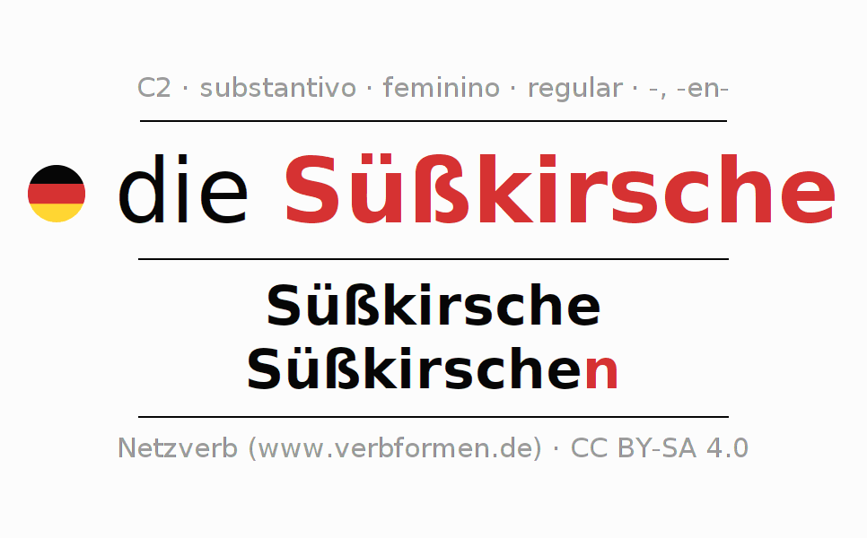 Declinação de Süßkirsche é apresentada em uma tabela com todas as formas no singular e no plural (plural) e em todos os quatro casos: nominativo (1º caso), genitivo (2º caso), dativo (3º caso) e acusativo (4º caso) . Especialmente para os alunos de alemão, a correta declinação da palavra Süßkirsche é fundamental.