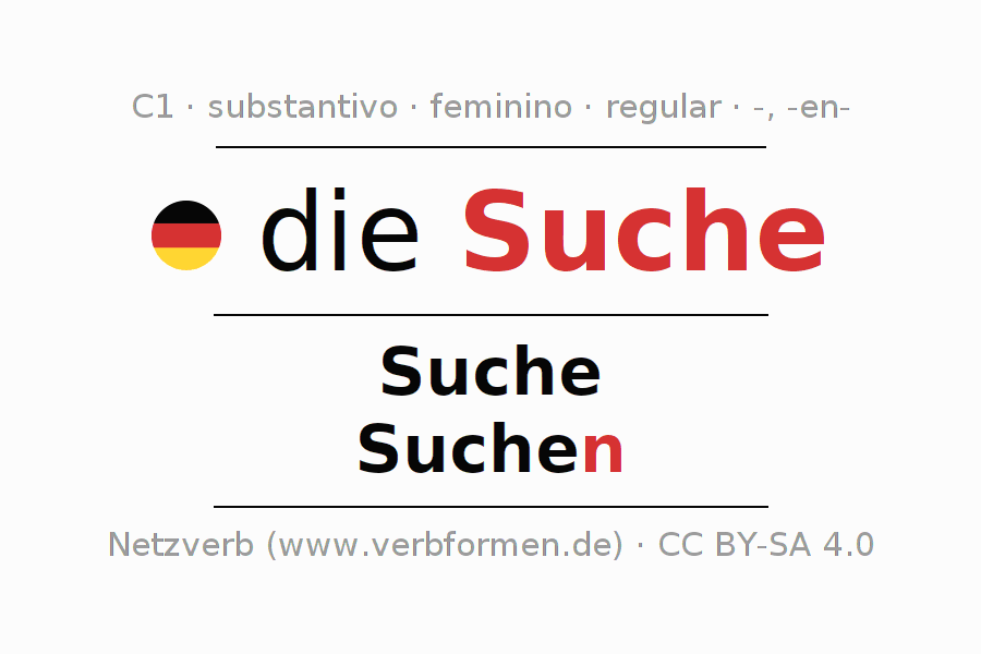 Declinação de Suche é apresentada em uma tabela com todas as formas no singular e no plural (plural) e em todos os quatro casos: nominativo (1º caso), genitivo (2º caso), dativo (3º caso) e acusativo (4º caso) . Especialmente para os alunos de alemão, a correta declinação da palavra Suche é fundamental.