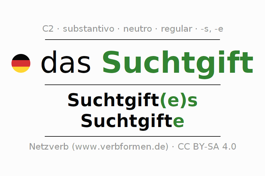 Declinação de Suchtgift é apresentada em uma tabela com todas as formas no singular e no plural (plural) e em todos os quatro casos: nominativo (1º caso), genitivo (2º caso), dativo (3º caso) e acusativo (4º caso) . Especialmente para os alunos de alemão, a correta declinação da palavra Suchtgift é fundamental.