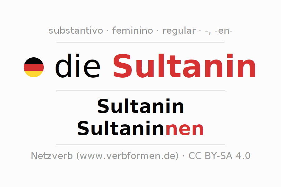 A declinação do substantivo Sultanin (sultana) está no genitivo singular Sultanin e no nominativo plural Sultaninnen . O substantivo fraco Sultanin é declinado com a terminação -/nen. O gênero gramatical de Sultanin é feminino e o artigo definido é "die". Não se pode somente declinar o substantivo Sultanin mas sim todos os substantivos em alemão. Comentários ☆