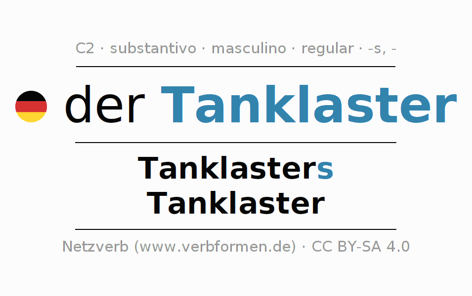 A declinação do substantivo Tanklaster (caminhão-tanque) está no genitivo singular Tanklasters e no nominativo plural Tanklaster . O substantivo forte Tanklaster é declinado com a terminação s/-. O gênero gramatical de Tanklaster é masculino e o artigo definido é 'der'. Não se pode somente declinar o substantivo Tanklaster mas sim todos os substantivos em alemão. O substantivo faz parte do vocabulário referente ao Certificado em Alemão do Nível C2. Comentários ☆